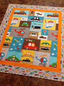 I made two Vroom quilts (by Leslie Grainger for Robert Kaufman fabrics) in the bright color way, and I will be making two more in the grey and blue color way. I'm not usually a big fan of panel quilts, but I loved the faux patchwork design of the main fabric. I used Kona cotton in School Bus for the orange inner border, and a striped fabric from the Vroom collection for the binding. I use stripe bindings whenever I can -- I love the interest they add to the overall design!