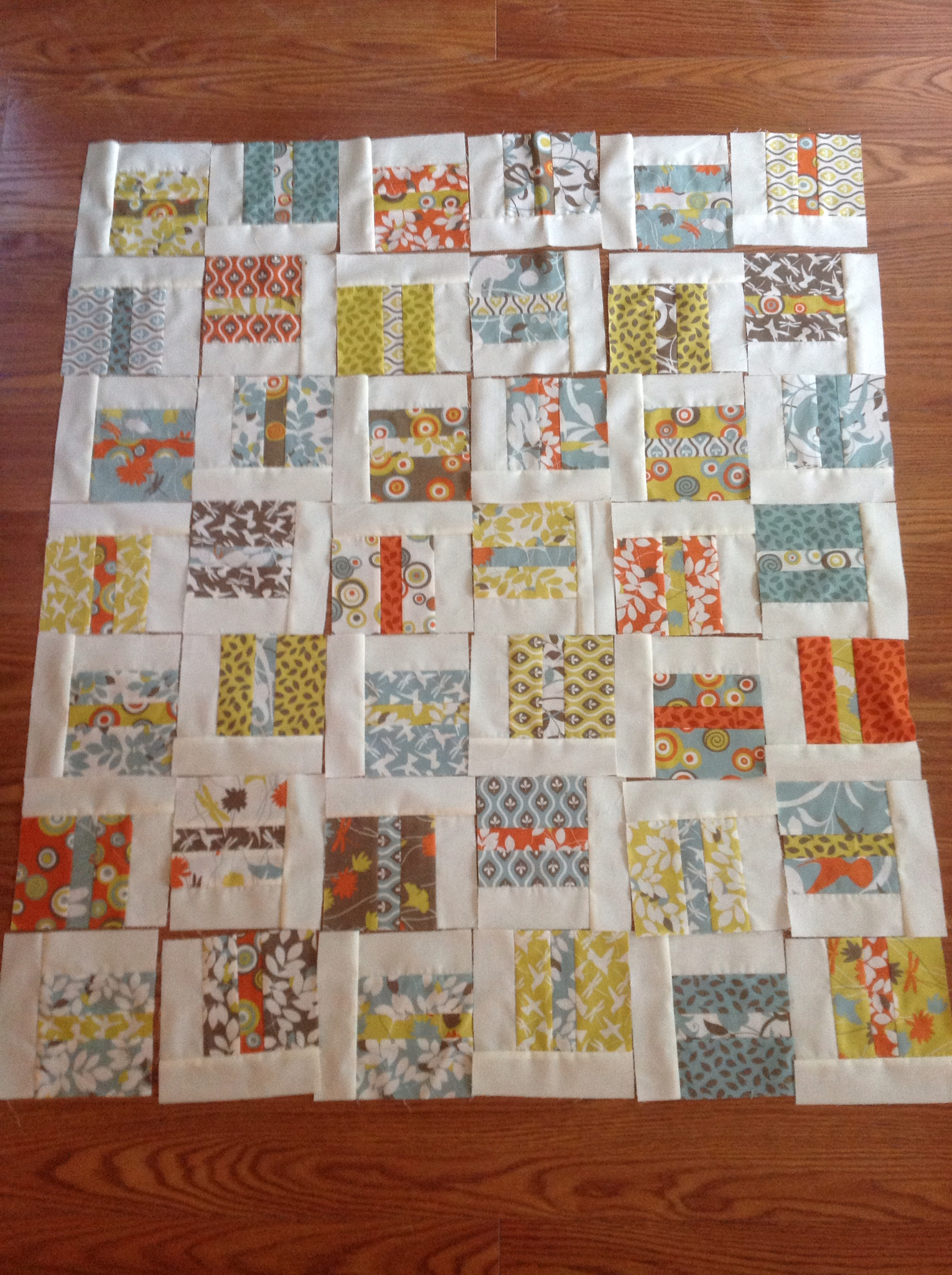 After making that quilt, I still had some miscellaneous pieces, so the blocks in this next quilt were inspired by another quilt in the book, Sweet Pea. I made the blocks a slightly different dimension, and changed the setting (the setting was actually based on Camille's Piece of Cake pattern!). This photo was also taken before the final assembly!